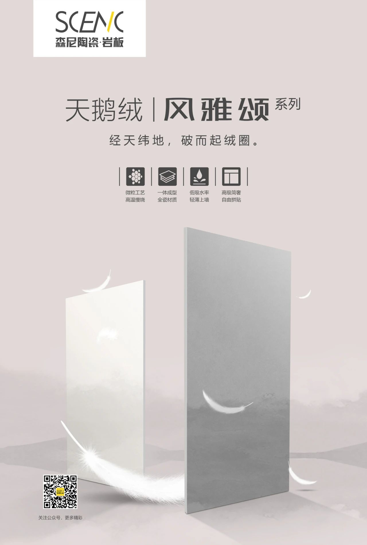 陶獨(dú)十大品牌森尼陶瓷巖板全國招商石材與素色的碰撞750x1500mm-天鵝絨系列雅灰色調(diào)演繹華美氣質(zhì)經(jīng)微光絨拋技術(shù)處理,產(chǎn)品色澤溫潤呈現(xiàn)微光感,符合人眼視覺感知舒