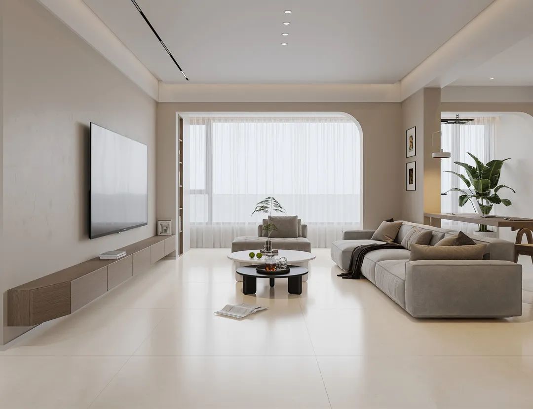 色系傳遞溫暖感受,近景材質(zhì)圓潤(rùn)飽滿,圓形茶幾、布藝沙發(fā)增添慵懶氛圍。