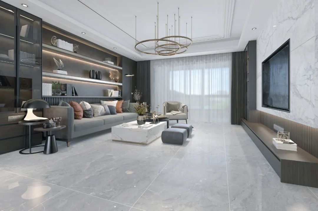 客廳在現(xiàn)代簡約灰的基礎(chǔ)色調(diào)下,搭配兩個小巧的深灰色凳子,碰撞出無可比擬的優(yōu)雅與高級。