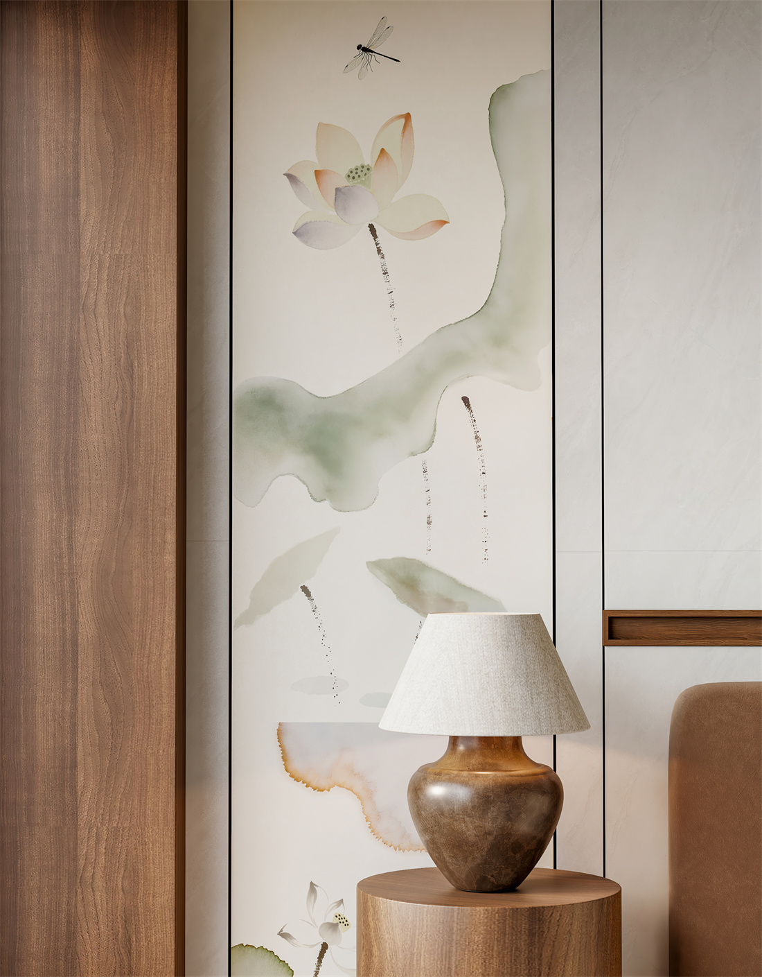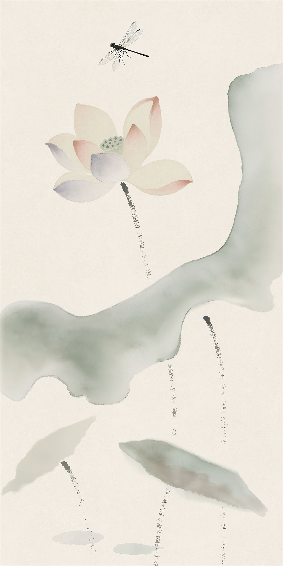 水墨氤氳勾勒荷花與蜻蜓,復(fù)刻中式復(fù)古筆觸,定格雨后荷塘的清雅朦朧之美。