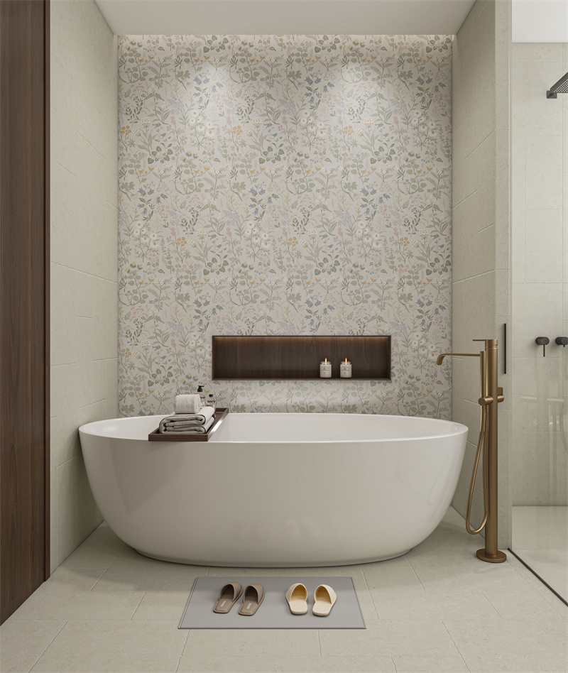 手繪百花錯(cuò)落鋪展,色調(diào)柔和如古典詞集,賦予墻面滿幅書香與自然生趣。